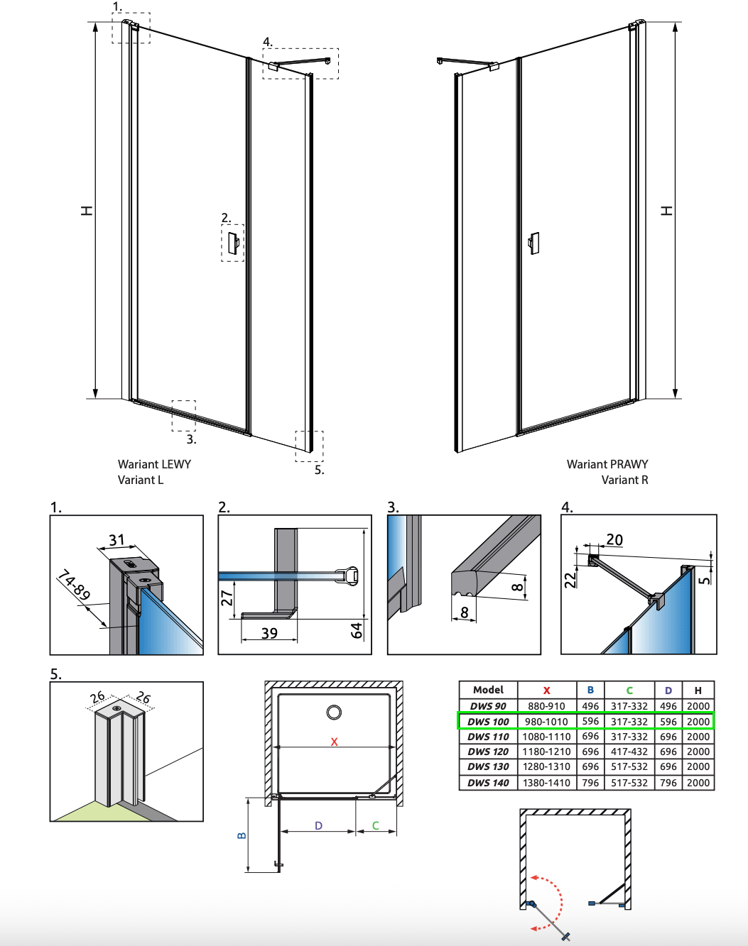 Strømberg Noma 45 svingdør m/sidepanel 1000mm - Højre - Børstet messing Brusenichedør med fast sidepanel - begge med paneler og greb på døren i børstet messing PVD. Specifikationer: